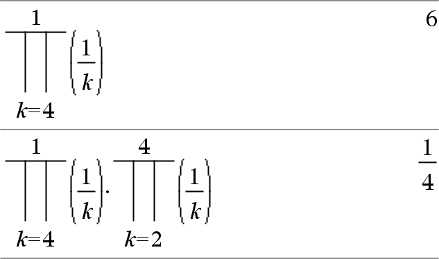 Π(Expr1, Var, Low, High) ⇒ expression Note: You can insert this function from the keyboard by typing prodSeq(...). Evaluates Expr1 for each value of Var from Low to High, and returns the product of the results. Note: See also Product template (Π), here. |