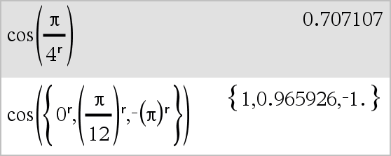 List1r ⇒ list Matrix1r ⇒ matrix This function gives you a way to specify a radian angle while in Degree or Gradian mode. In Degree angle mode, multiplies the argument by 180/π. In Radian angle mode, returns the argument unchanged. In Gradian mode, multiplies the argument by 200/π. Hint: Use r if you want to force radians in a function definition regardless of the mode that prevails when the function is used. Note: You can insert this symbol from the computer keyboard by typing @r. |