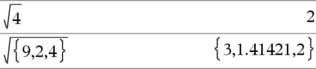 √(List1) ⇒ list Returns the square root of the argument. For a list, returns the square roots of all the elements in List1. Note: You can insert this function from the keyboard by typing sqrt(...) Note: See also Square root template, here. |