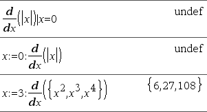 Consider the example on the right. The first derivative of x•(x^2+x)^(1/3) at x=0 is equal to 0. However, because the first derivative of the subexpression (x^2+x)^(1/3) is undefined at x=0, and this value is used to calculate the derivative of the total expression, d() reports the result as undefined and displays a warning message.