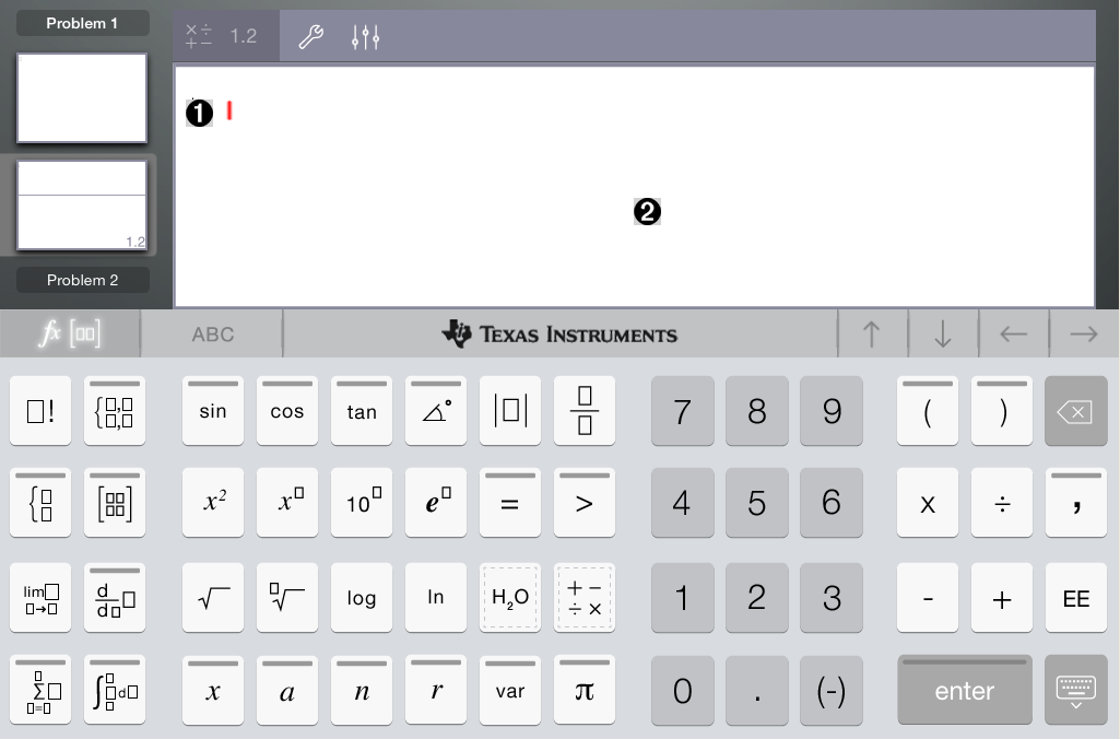 L’application Calculs est ajoutée au classeur. Le clavier TI‑Nspire™ est affiché par défaut et le curseur est positionné au niveau de la ligne de saisie.