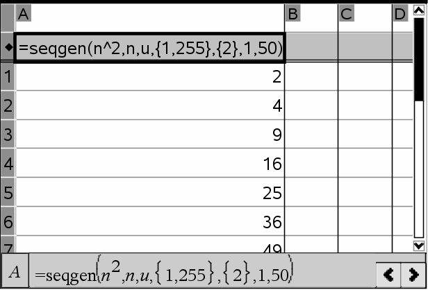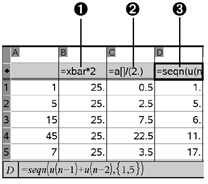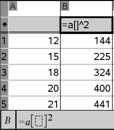 | 2. | Skriv udtrykket for formlen efter = og tryk på ·. Anvend kantparenteser ([]) efter de søjlebogstaver, du medtager i formlen. Skriv for eksempel =a[]^2 for at oprette en søjle med værdier, hvor hver celle er kvadratet på den tilsvarende celle i søjle A. |