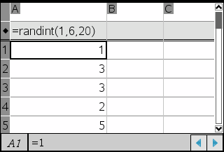 | 2. | Skriv RandInt(1,6,20) efter lighedstegnet. |