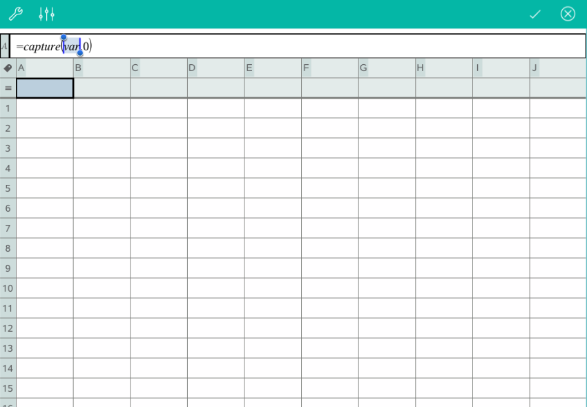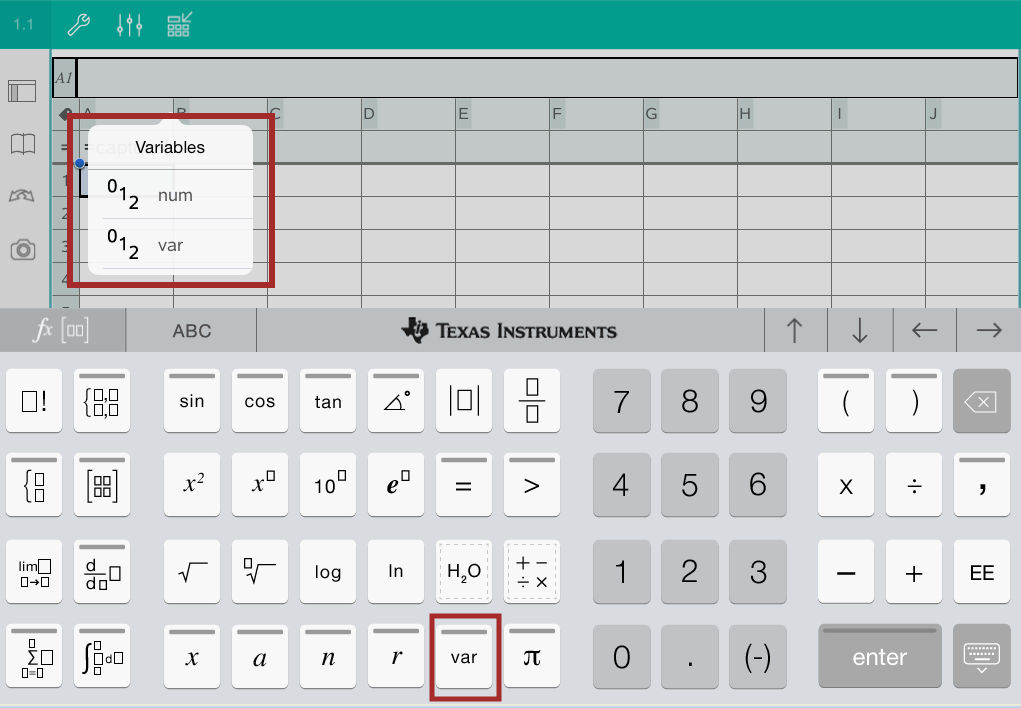 | 3. | Replace the letters “var” with the name of the variable to capture from Graphs & Geometry. For example, type a or to view a list of available variables, tap var on the TI‑Nspire™ Keyboard. |