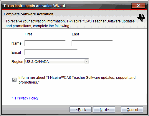 Udfyld felterne med navn og e-mail, og vælg derefter det område, du bor i, hvis det adskiller sig fra standardudfyldningen. Hvis du vil modtage e-mails fra TI om opdateringer, support og kampagner, skal afkrydsningsfeltet være markeret. |