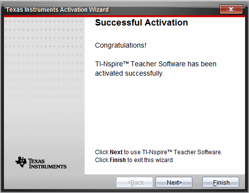 Hvis licensnummeret er gyldigt, åbnes dialogboksen Aktivering gennemført. Hvis licensnummeret ikke er gyldigt, skal du kontrollere, om det er skrevet korrekt. Hvis problemet varer ved, skal du kontakte TI Support.