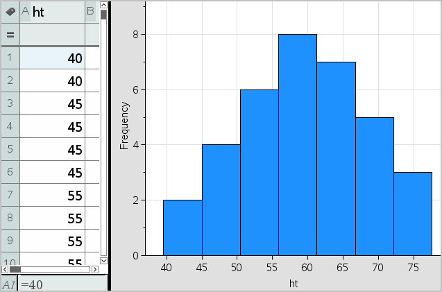 | 1. | Erstellen Sie auf einer Lists & Spreadsheet-Seite zwei Listen: eine mit den „Säulen“, z. B. den Größen einer Population (ht), und eine zweite mit den Häufigkeiten der jeweiligen Größen (freq). |