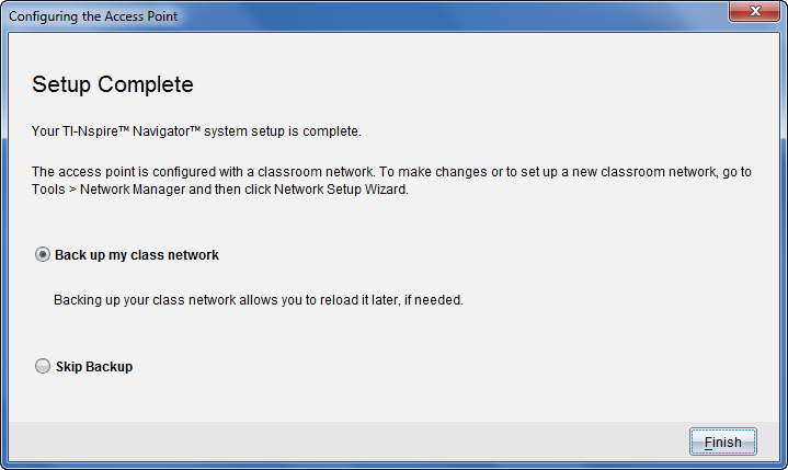 Die Software ordnet die drahtlosen Geräte dem Klassen-Netzwerk zu. Nach Abschluss dieses Vorgangs wird das Dialogfeld „Einrichtung abgeschlossen“ angezeigt.
