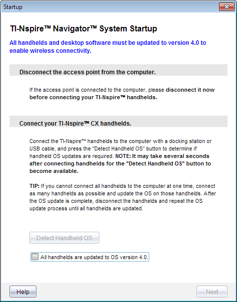 Bei der Installation oder Aktualisierung der TI‑Nspire™ CX Teacher Software nach erstmaligem Öffnen wird das Dialogfeld Start angezeigt. Alle von Schülern und im Unterrichtsraum verwendeten Handhelds müssen auf die aktuelle Betriebssystemversion aktualisiert werden.