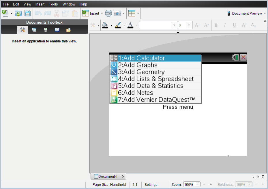 | • | Neues TI‑Nspire™-Dokument – Handheld-Seitengröße |