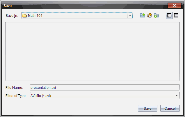 You can record and save the live presentation as a movie (.avi file). Movies are a useful way to present demonstrations to a class, provide additional tutoring for difficult concepts, or provide a way for students who missed the class to review the lesson. When you record the presentation, only the handheld screen is captured. The handheld display and the keys pressed are not recorded. When you save a recorded presentation, the file is saved with the Audio Video Interleave (.avi) file extension.