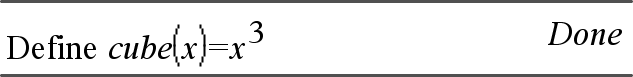 | 1. | On the Calculator entry line, type Define cube(x)=x^3 and press Enter. |