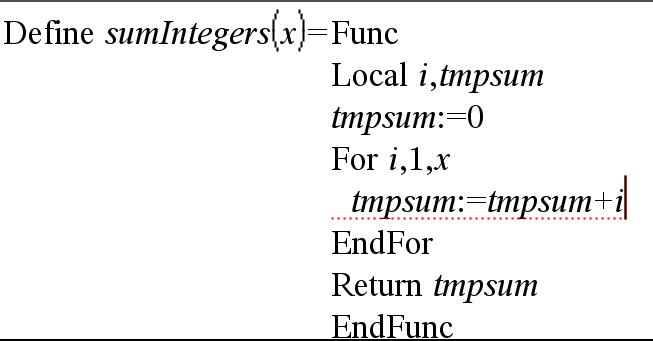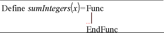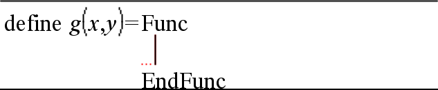 Note: You can create multiple-line functions only by using the Define command. You cannot use the := or → operators to create multiple-line definitions. The Func...EndFunc template serves as a container for the statements.