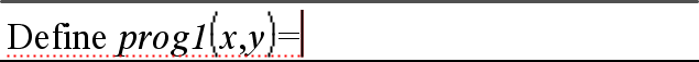 | 1. | On the Calculator entry line, type Define prog1(x,y)=. Do not press Enter yet. |