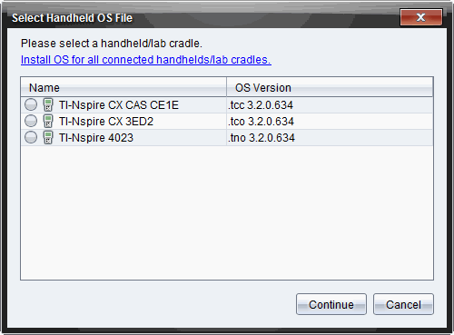 Seleccione TI‑Nspire.tcc. para actualizar un dispositivo portátil TI‑Nspire™ CX CAS. |