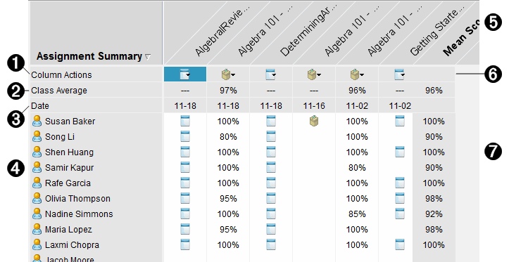Encabezado de columna. Muestra el nombre de la tarea guardada en el Espacio de Trabajo de Portafolio. Puede realizar las mismas acciones en el encabezado de columna que en las acciones de columna. Haga clic derecho en el encabezado de columna para abrir el menú. El encabezado de columna Calificación Promedio muestra la calificación promedio tanto de todas las tareas como de todas las tareas por estudiante. Haga clic con el botón derecho en la columna Calificación Promedio para ordenar las calificaciones de forma ascendente o descendente. |