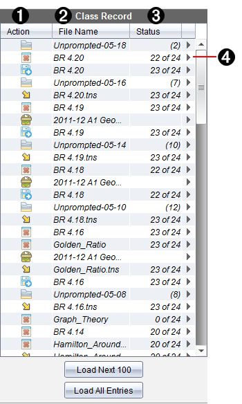 Depuis l’Enregistrement de classe, vous pouvez ouvrir un classeur dans l’espace de travail Évaluer, enregistrer un classeur dans l’espace de travail Portfolio, regrouper des fichiers provenant de l’espace de travail Enregistrement de classe, envoyer et supprimer des fichiers à l’aide de la barre d’outils ou encore visualiser les propriétés du classeur via Enregistrer propriétés élément, pour tous les classeurs TI‑Nspire™ à l’exception des fichiers Questions rapides.