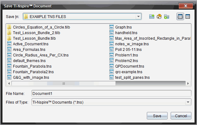 La boîte de dialogue Enregistrer le classeur TI‑Nspire™ (Save TI-Nspire Document) apparaît.