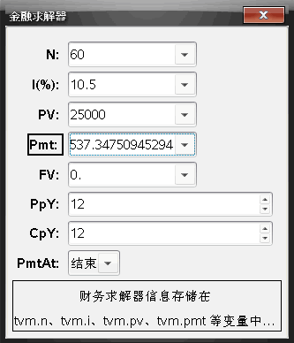 求解器将计算值并将所有值存储到“tvm.”变量中,例如 tvm.n 和 tvm.pmt。相同问题内的所有 TI‑Nspire™ 应用程序都可以访问这些变量。