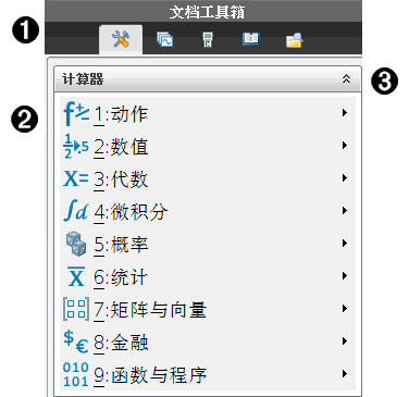 在以下示例中,“文档工具”菜单将打开,显示计算器应用程序的选项。 在 TI‑Nspire™ 文档中,“文档工具”菜单包含使用应用程序时的可用工具。 这些工具专用于活动应用程序。