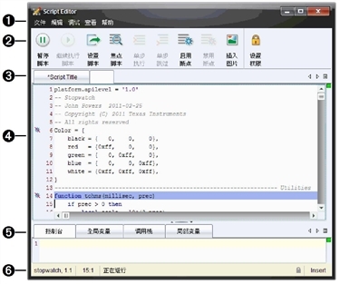 菜单栏。 包含与脚本编辑器相关的选项。 |
