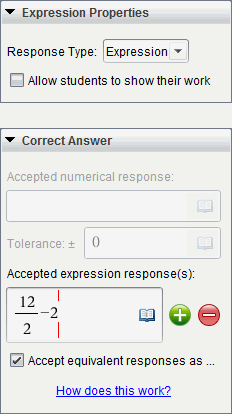 在表达式类型答案中,您可选择是否接受等效答案为正确答案。 |