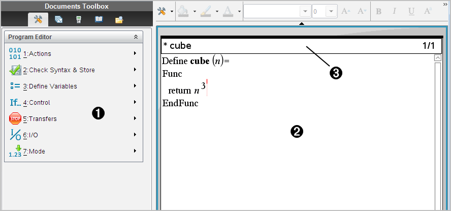 您可以在 計算工具輸入列上輸入定義語句,或使用 [程式編輯器],來建立使用者自行定義的函數或程式。 [程式編輯器] 提供了一些好處,將會在本節中介紹。 如需更多資訊,請參閱計算工具。