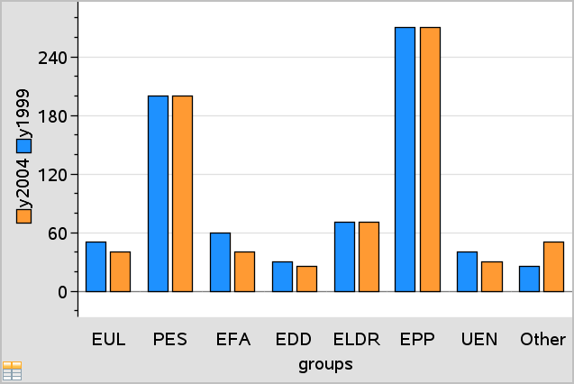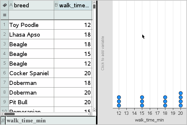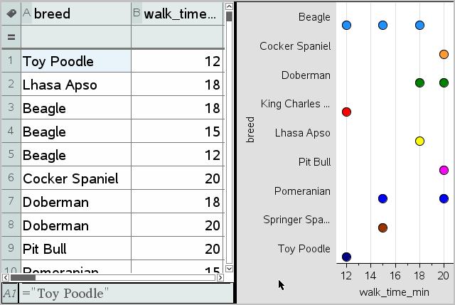 Les types de tracé par catégories peuvent être utilisés pour comparer la représentation des données dans différents tracés. Lorsque, dans une activité, la même variable (liste) est utilisée pour un diagramme à points et un diagramme en rectangles ou un diagramme circulaire, la sélection d’un point ou d’un segment de données dans l’un des tracés sélectionne le point, le segment ou la barre de données qui lui correspond dans tous les autres tracés qui contiennent la variable.