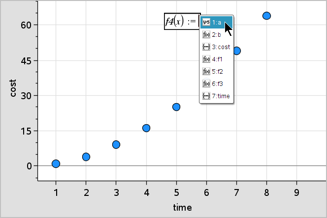 Note: Function numbers increment to use the next available. If you have defined f1(x) and f2(x) in Graphs & Geometry, the first function you create in Data & Statistics will be f3(x).