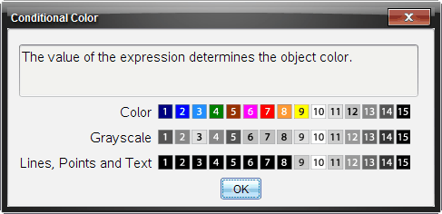 | 4. | (Optional) Geben Sie Zahlen oder Ausdrücke ein, die Zahlen in den anwendbaren Farbfeldern wie z. B. Linienfarbe oder Netzfarbe ergeben. Klicken Sie die Schaltfläche Farben an, um die Werte der Farbzuordnungen anzuzeigen. |