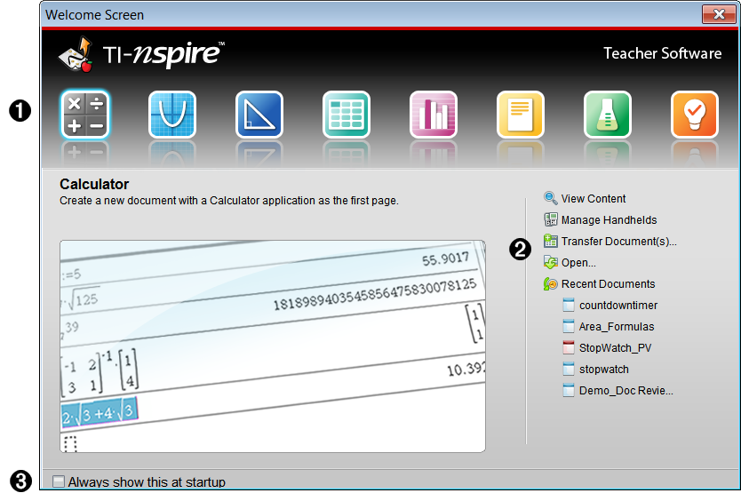 TI‑Nspire™ 應用程式。 按一下其中一個圖示,可經由所選取已啟動應用程式來建立新文件。 應用程式包括計算工具、函數繪圖、幾何作圖、序列與試算表、數據與統計、筆記、問題和威尼爾DataQuest™ 應用程式。 按一下圖示以關閉「歡迎使用」畫面,並在「文件工作空間」中開啟所選取應用程式。 |