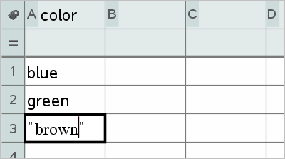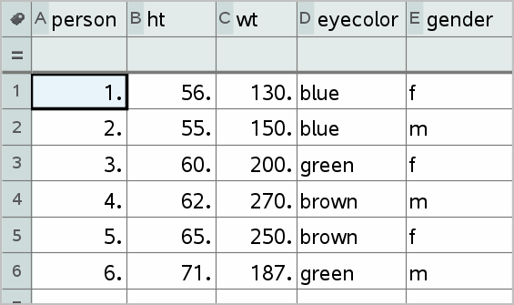 | 1. | Create a list that holds the category identifiers. For this example, name the list “color” and type strings for eye color. Enclose category names in quotes to prevent them from being interpreted as variables. |