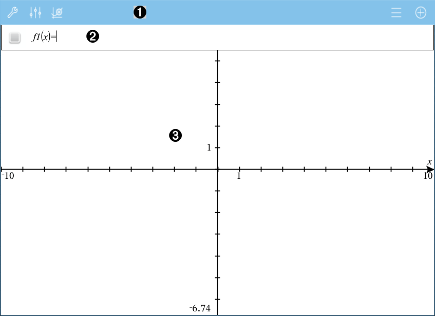 Eingabezeile. Dient zur Definition der Relationen, die Sie graphisch darstellen möchten. Der Standard-Graphentyp ist „Funktion“, daher wird zunächst das Format f1(x)= angezeigt. Sie können von jedem Typ 99 Relationen definieren. |