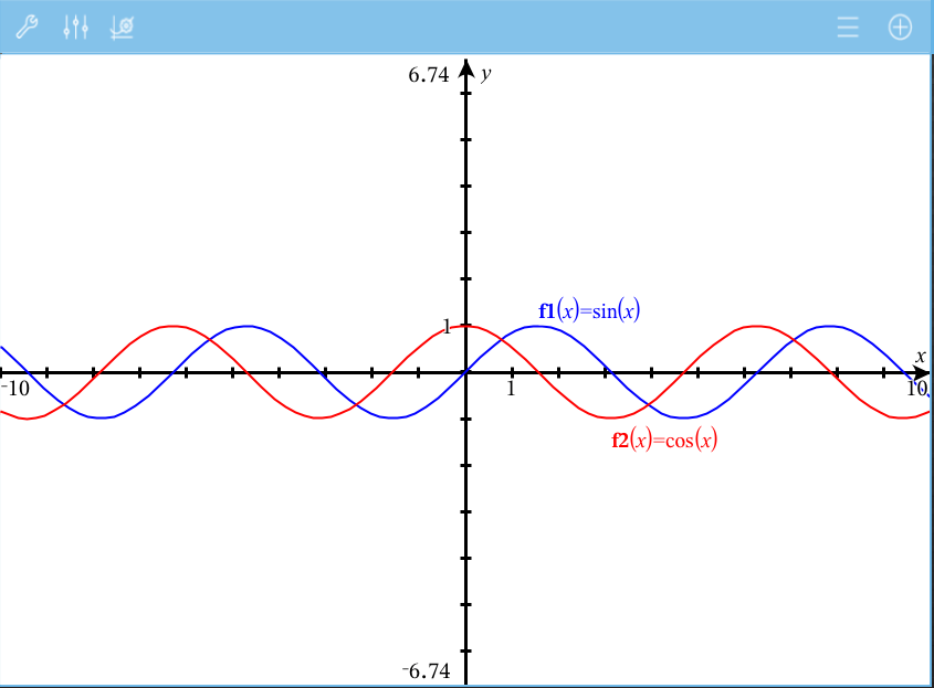 Für dieses Beispiel zeigt der Graph jetzt f1(x)=sin(x) und f2(x)=cos(x).