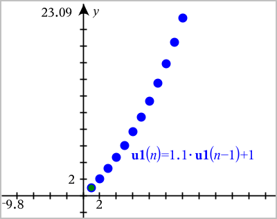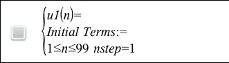 | 3. | Geben Sie einen Anfangswert ein. Wenn der Folgeausdruck auf mehr als einen vorangegangenen Term verweist, z. B. u1(n-1) und u1(n-2) (oder u1(n) und u1(n+1)), trennen Sie die Terme durch Kommas. |