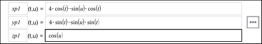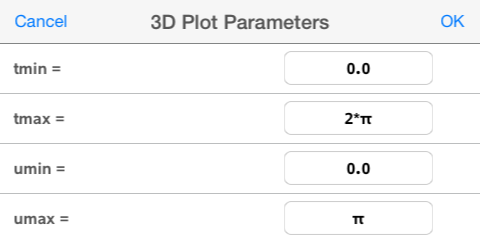 | 3. | (Optional) Tippen Sie auf , um die 3D-Diagrammparameter auf tmin, tmax, umin und umax zu setzen. |