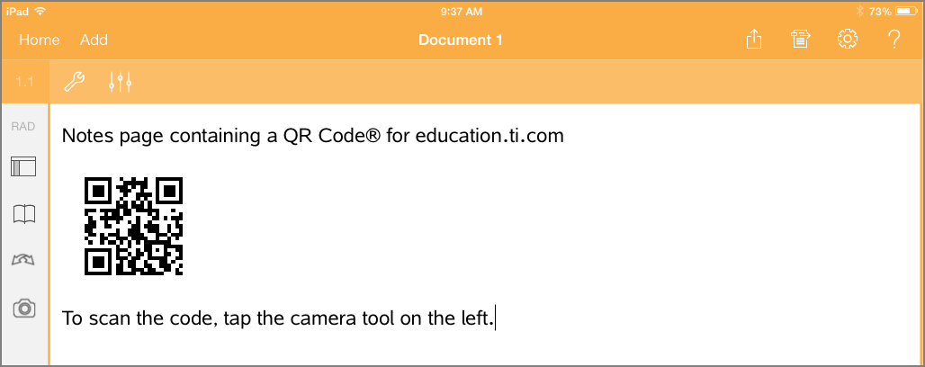 Autoren von TI-Nspire™- Dokumenten können einen QR Code® in jede Notes Page einfügen oder pasten. User, die das Dokument mit der TI-Nspire™ App für iPad® ansehen, können der App vorgeben, den Code direkt von der Seite zu scannen und es mit seinem entsprechenden Ziel zu verbinden. Lua Scripts können auch einen QR Code® aufzeigen, den Sie innerhalb der App scannen können.