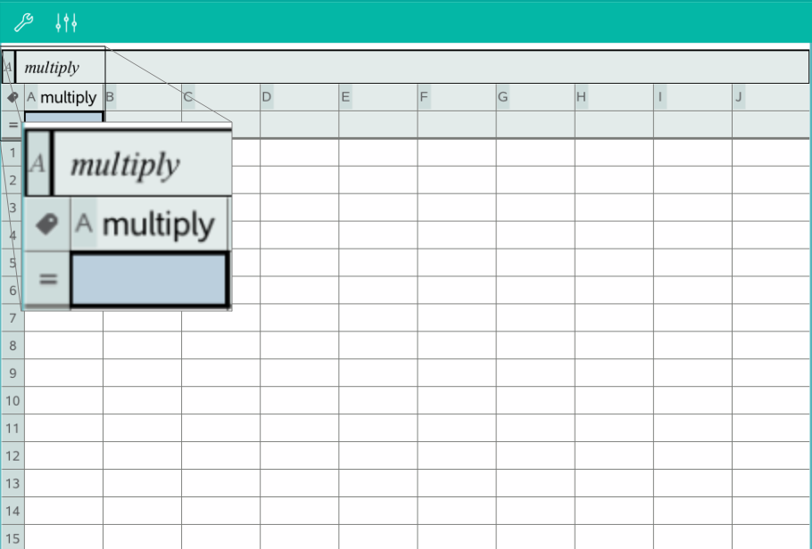 Wenn Sie oben in einer Lists & Spreadsheet-Spalte einen Namen angeben oder eine Variable aus einem Zellwert erstellen, wird dieser Wert automatisch als Listenvariable gespeichert. Nachdem Sie die Variable definiert haben, können Sie in den Applikationen Graphs, Geometry, Calculator und Data & Statistics sowie in anderen Lists & Spreadsheet-Seiten innerhalb des aktuellen Problems eine Verknüpfung zu ihr herstellen.