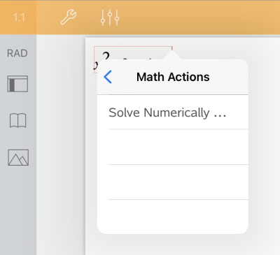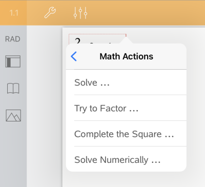 | 2. | Haga un punteo en la ecuación para mostrar el menú de contexto y seleccione Acciones matemáticas. |