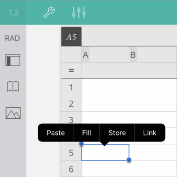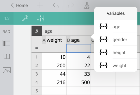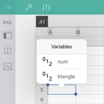Cuando enlaza una celda o columna con una variable, Listas y Hoja de Cálculo actualiza los valores para reflejar el valor actual de la variable. La variable puede ser cualquier variable en el problema actual y se puede definir en Gráficos, Geometría, Calculadora o cualquier instancia de Listas y Hoja de Cálculo.