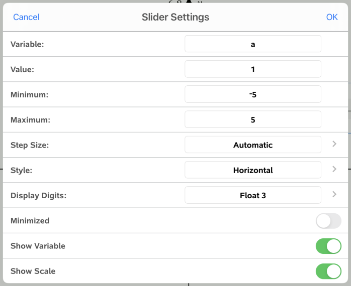 Des curseurs peuvent être créés automatiquement dans l’application Graphiques et dans la fenêtre Analyse de l’application Géométrie. Quand vous définissez certaines fonctions, équations ou suites faisant référence à des variables non définies, des curseurs automatiques sont créés.