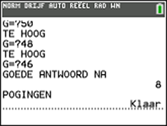 Vergelijkbaar, als het geraden getal G lager is dan het te raden getal G, tooy TE LAAG. Als G=N, zal de lus nog niet afgesloten zijn, maar evenmin zal de instructie Disp uitgevoerd worden, omdat G niet groter is dan N en G ook niet kleiener is dan N.</n