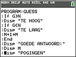 Probeer dit eenvoudige raadspel in elkaar te zetten. Je creëert een nieuw programma met de naam ‘Guess’ en dan typ je de programmacode in je rekenmachine. Bedenk dat je bijna alle programmeerinstructies die je nodig hebt, kunt vinden in het menu programma-instructies onder de toets [PRGM]. De enige uitzondering is randInt(, dit kun je vinden onder het tabblad Prob van het menu Math ( [MATH] ).