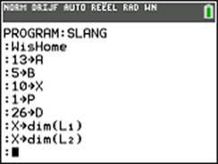 initialiseren de x- en y-coördinaten van de letter die getekend zal worden. We gebruiken niet de variabelen X en Y, omdat het besturingssysteem van de rekenmachine de variabele Y soms aanpast als je instructies van het grafiekenscherm gebruikt. In dit programma is A de x-coördinaat en B de y-coördinaat. Kolom 13, rij 5 is ongeveer in het midden van het beginscherm van de rekenmachine met kleur.