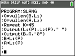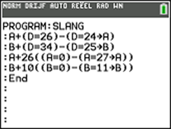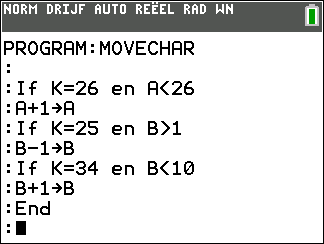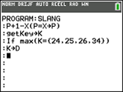 Hanteer toetsaanslagen. Zoals altijd, slaan we de toetsaanslag op in K, zodat de Repeat-voorwaarde K=45 kan zien of [CLEAR] ingedrukt is. De voorwaardelijke opdracht is kort en staat voor: Als K=24 of K=25 of K=26 of K=34. K={24,25,26,34} produceert een lijst met 4 elementen, die de elementen {K=24,K=25,K=26,K=34} bevat: dat is een reeks van enen en nullen. De instructie max() geeft de grootste waarde van een lijst terug, dus als K gelijk is aan een van deze vier getallen, dan zal er een 1 staan in de resulterende lijst en zal het maximum 1 zijn. Als K niet gelijk is aan een van deze vier toetscodes, dan zal de lijst gevuld worden met nullen en zal het maximum van de lijst 0 zijn.