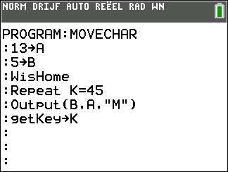 Herhaalt alle programmacode tussen Repeat en End (de lus van gebeurtenissen) totdat de variabele K gelijk is aan 45 (de toetscode voor [CLEAR]).