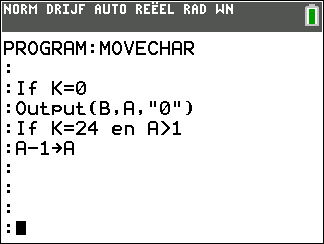 Tekent een spatie over de M die op het beginscherm stond en wist deze zo effectief. Deze programmaregel wordt alleen uitgevoerd als K niet nul is.
