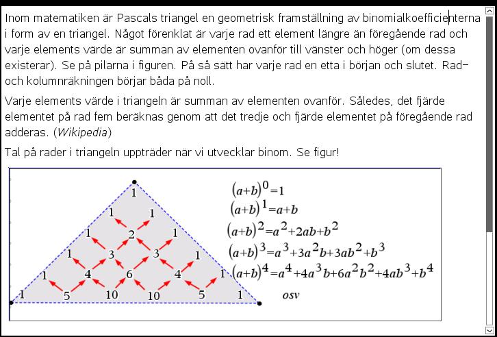 Framställningen leder fram till binomialsatsen och vi visar hur talen i Pascals triangel kan härledas till koefficienter i en binomutveckling.