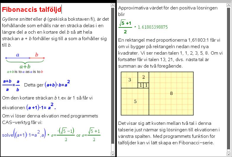 Denna världsberömda talserie förekommer i många olika sammanhang i matematiken, naturen, konsten och arkitekturen. De som är intresserade av denna talföljd kan hitta otrolig mängd material. Bl.a. förekommer den i boken Da Vinci-koden och den har fascinerat många människor under lång tid. Vi tror att många matematikintresserade elever på gymnasiet kan ha intresse av Nspire-dokumentet, även om man formellt studerar talföljder först i kurs 5. Där tar man ju upp begrepp som rekursion bl.a.